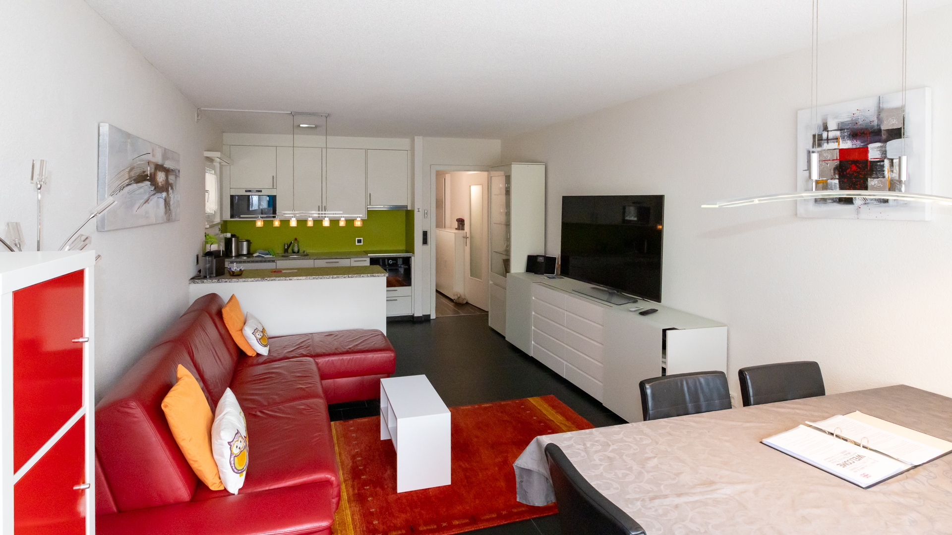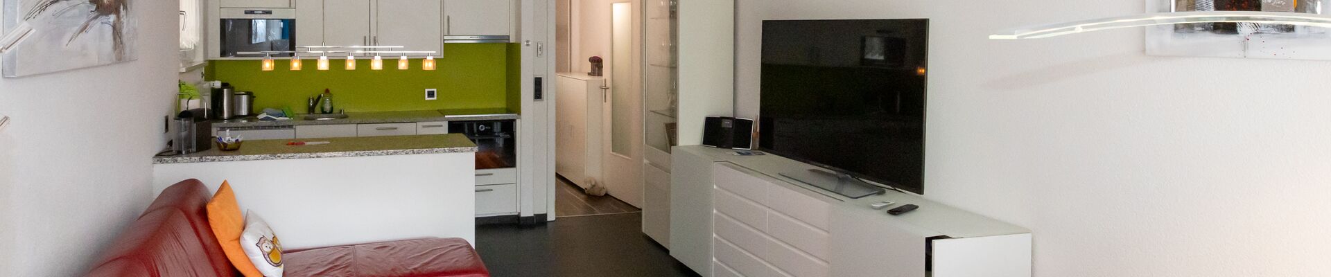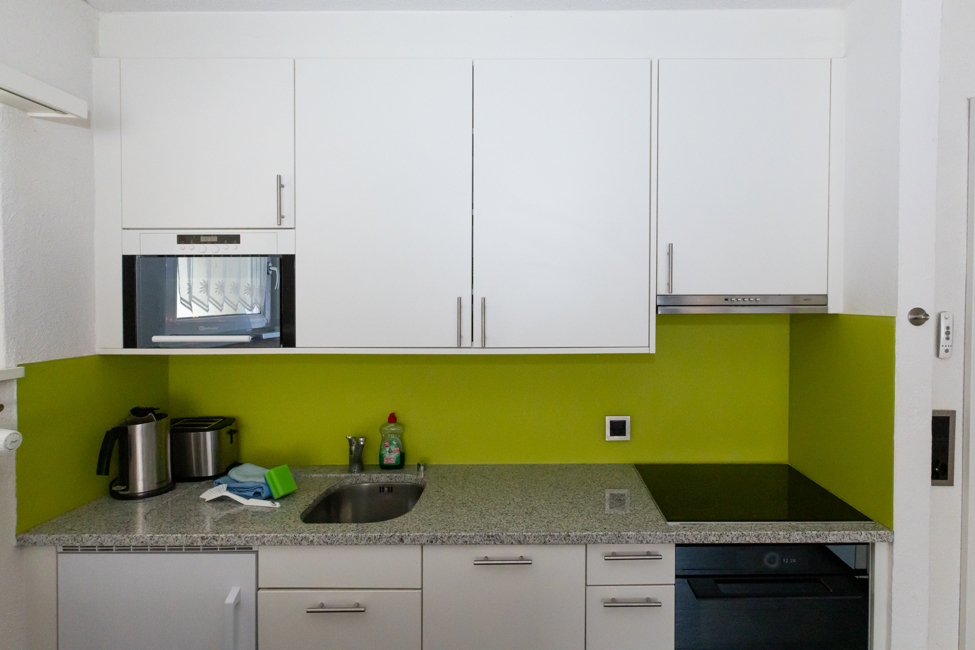Die Wohnküche ist voll ausgestattet mit Kühlschrank, Geschirrspüler, Backofen, Mikrowelle, Kaffeemaschine (Nespresso), Flachbild-TV mit Swisscom-Box und einem gemütlichen Sitzbereich mit bequemen Ledersofa (Bettsofa).