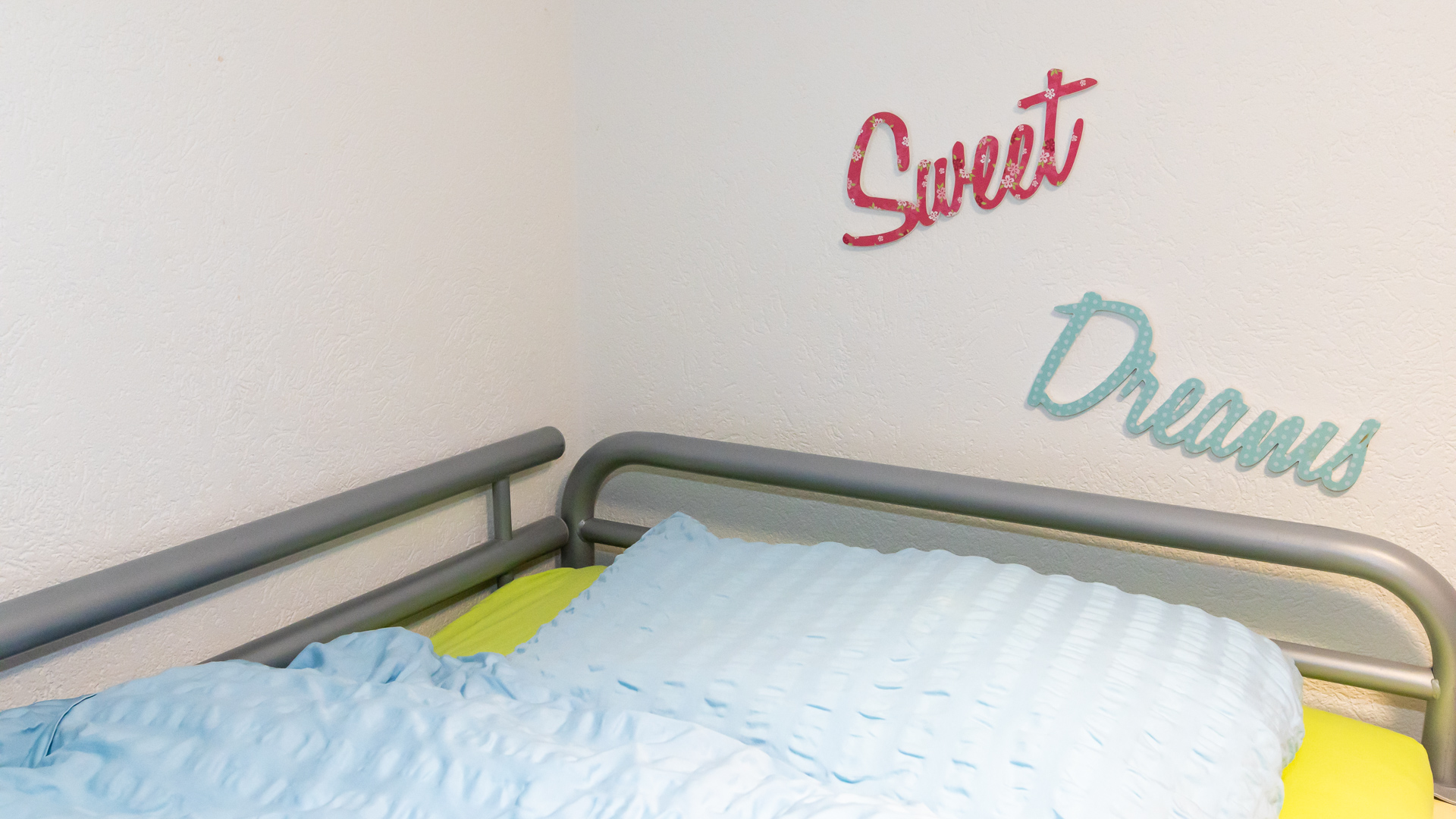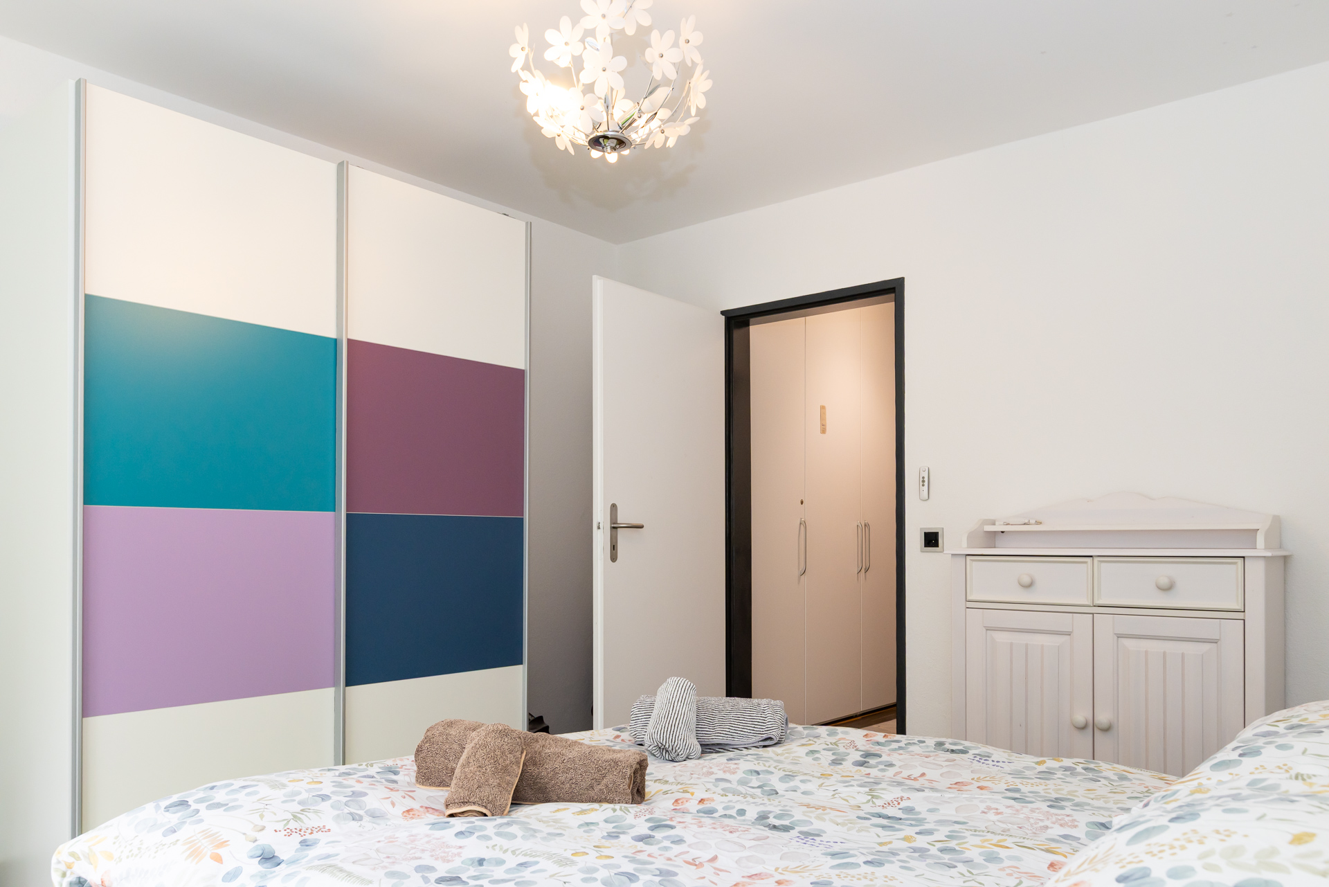 Die Ferienwohnung hat zwei Schlafzimmer (ein grosszügiges Doppelschlafzimmer und ein kleines Zimmer mit Etagenbett.